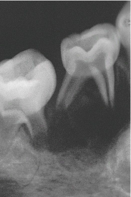 Periapical radiograph showing marked bone loss involving the mandibular teeth in a young girl, resulting in a “floating-in-air” appearance of the teeth.