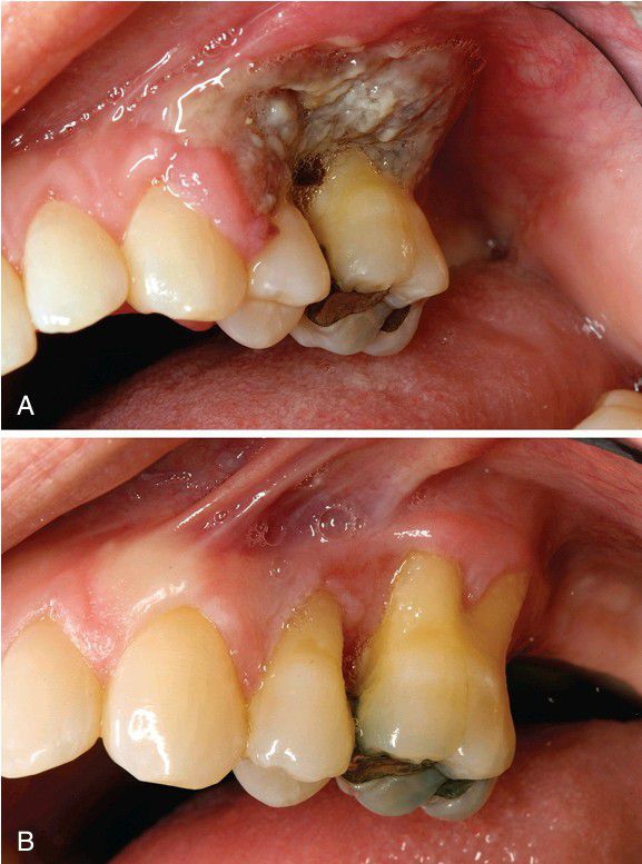 A, This 42-year-old woman, treated for autoimmune hepatitis with mycophenolate mofetil, developed painful gingival ulcers. B, Resolution of the lesion after immune suppression was stopped and rituximab therapy was initiated.