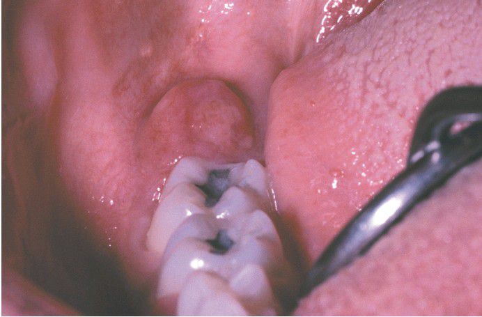 This patient had documented American Burkitt lymphoma involving the abdominal region. The retromolar swelling represents oral involvement with the malignancy.