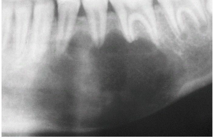 Panoramic film showing a large simple bone cyst of the mandible in a 12-year-old girl. The scalloping superior aspect of the cyst between the roots of the teeth is highly suggestive of, but not diagnostic for, a simple bone cyst.