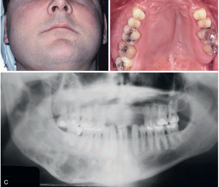 Jaffe-Lichtenstein syndrome. A, Young man exhibiting enlargement of the right maxilla and mandible. B, Intraoral photograph showing unilateral maxillary expansion. C, Panoramic radiograph showing ill-defined lesions of the right side of both jaws.