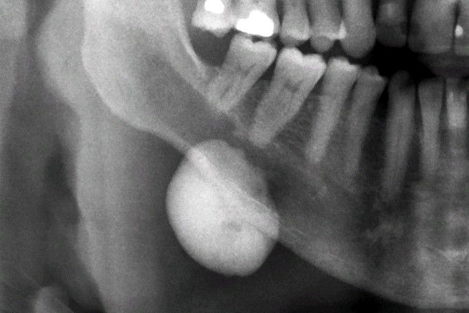 . Panoramic radiograph showing a uniformly sclerotic mass arising from the surface of the posterior mandible.