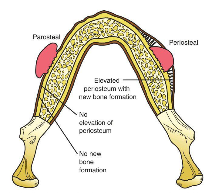 Illustration comparing different types of peripheral osteosarcoma. Parosteal osteosarcoma presents as a lobulated nodule without a peripheral periosteal reaction. Periosteal osteosarcoma presents as a sessile mass associated with significant periosteal new bone formation.