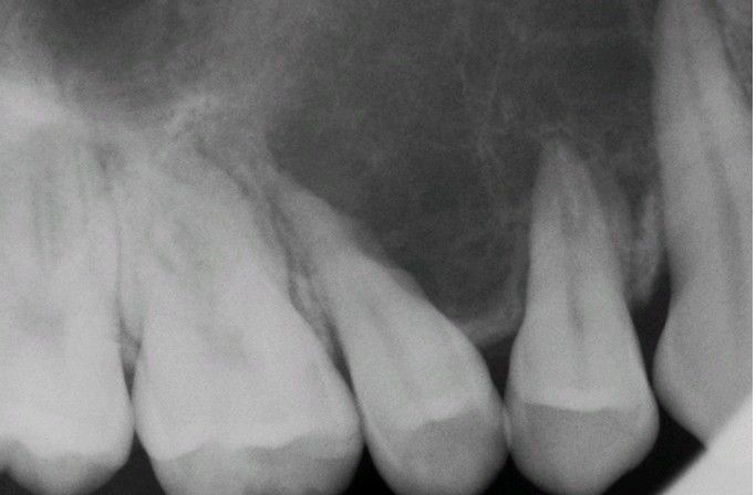 Periapical radiograph showing an ill-defined radiolucency with associated root resorption.