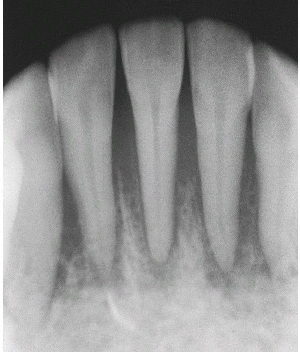 Periapical radiograph showing widening of the periodontal ligament spaces.