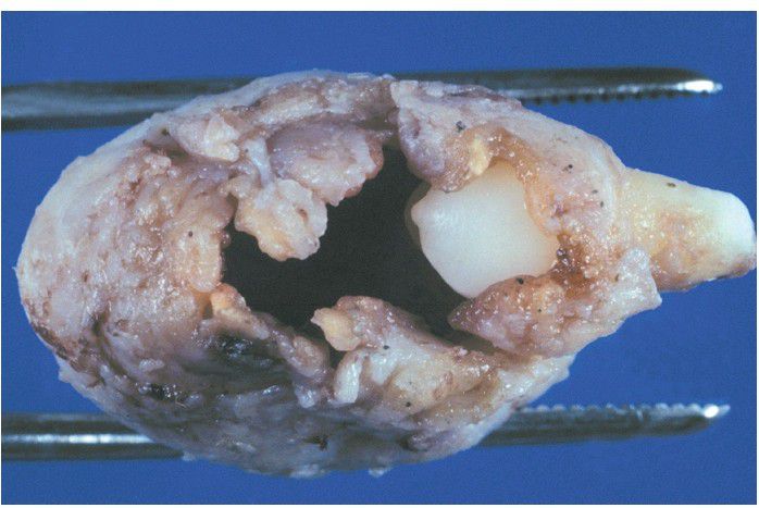 Gross specimen of a dentigerous cyst involving a maxillary canine tooth. The cyst has been cut open to show the cyst-to-crown relationship.