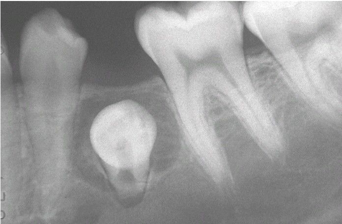 . Radiolucent lesion involving the crown of an unerupted mandibular premolar. Distinction between a dentigerous cyst and an enlarged follicle for a lesion of this size by radiographic and even histopathologic means is difficult, if not impossible.