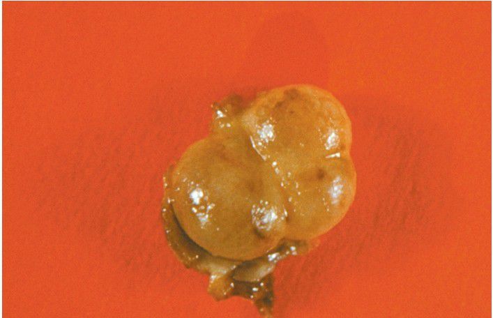 Gross specimen of a botryoid variant. Microscopically, this grapelike cluster revealed three separate cavities.