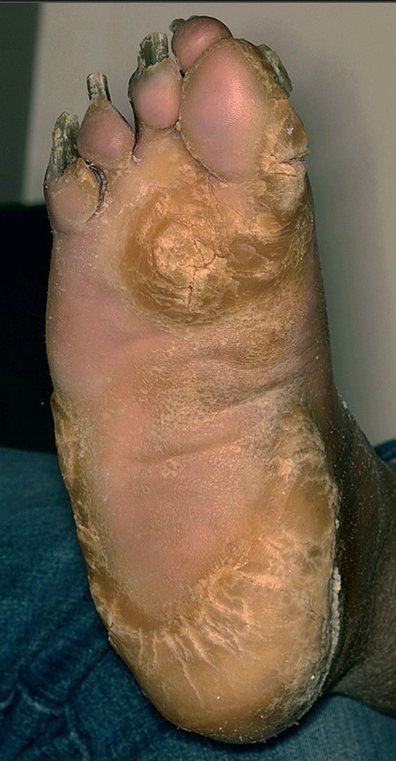 The soles of the feet of affected patients typically show marked callus-like thickenings.