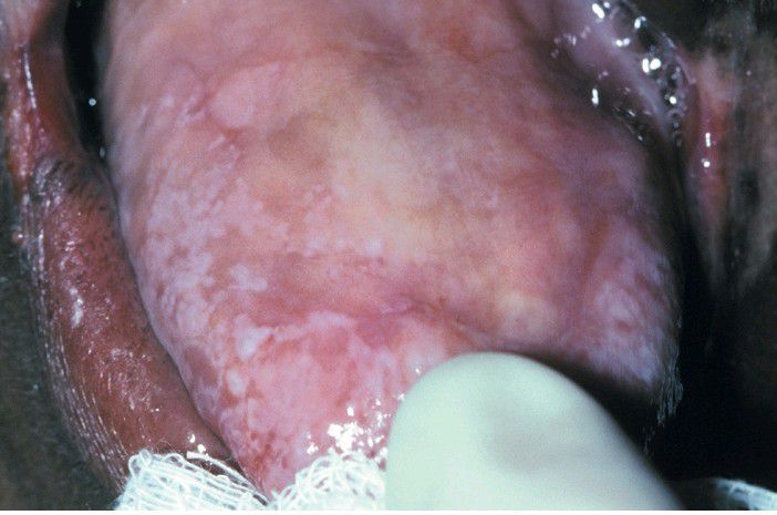 . Atrophy and hyperkeratosis of the dorsal tongue mucosa are visible.