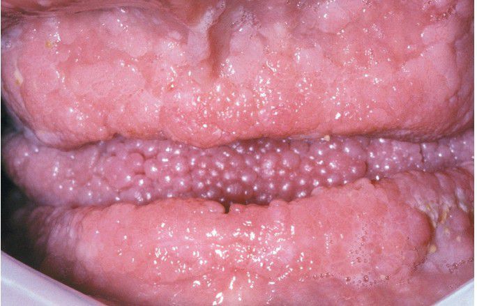 Multiple, irregular f ibroepithelial papules involve the tongue (center) and alveolar ridge mucosa.