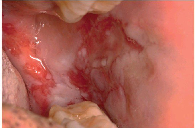 Multiple erosions of the left buccal mucosa and soft palat