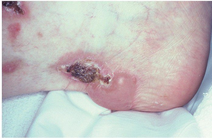 Cutaneous vesiculobullous lesions of the heel. The bullae eventually rupture, leaving hemorrhagic crusted areas.