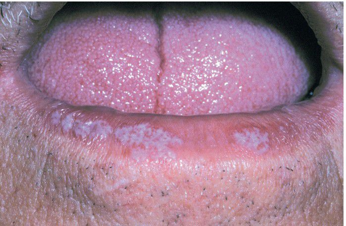 Reticular lesions of the lower lip vermilion.