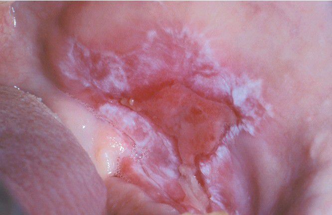Ulceration of the buccal mucosa shows peripheral radiating keratotic striae, characteristic of oral erosive lichen planus.