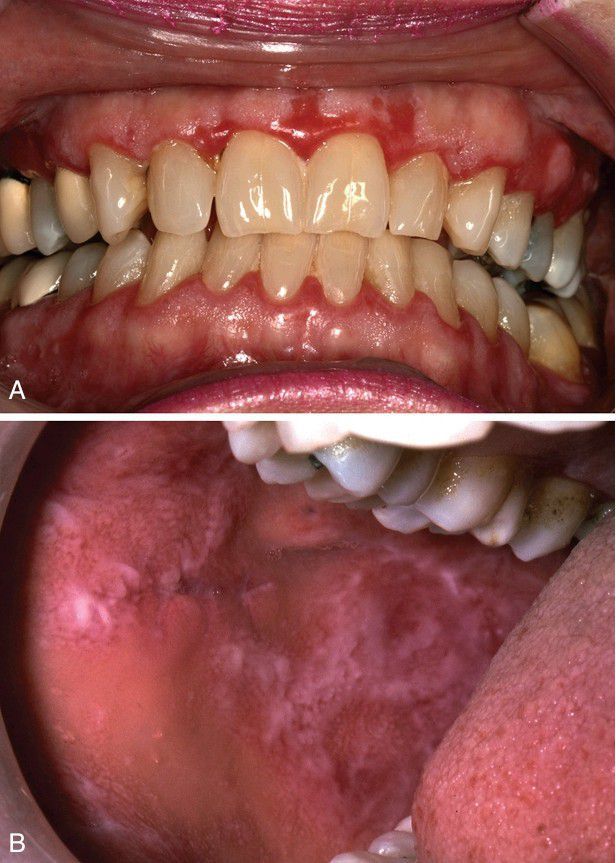 A, Gingival lesions having a “desquamative gingivitis” presentation, requiring biopsy with direct immunofluorescence studies for diagnosis. B, Buccal mucosal involvement. The lesions appear somewhat lichenoid, although classic Wickham striae are not evident.
