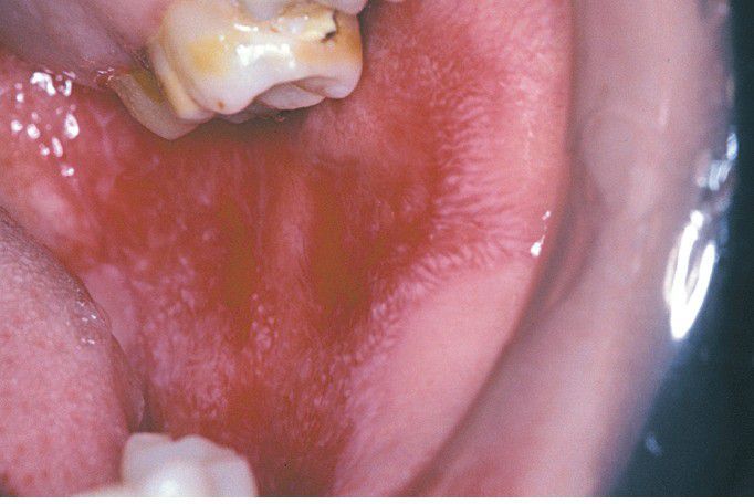 Radiating keratotic striae surround erythematous zones of the buccal mucosa. These features are similar to those of erosive lichen planus.
