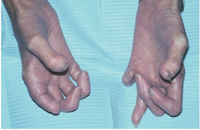 The tense, shiny appearance of the skin is evident. Note that the fingers are fixed in a clawlike position, with some showing shortening as a result of acro-osteolysis.