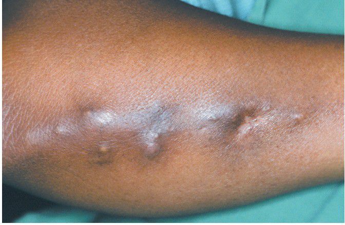 The subcutaneous nodules on this patient’s arm represent deposition of calcium salts (calcinosis cutis). (Courtesy of Dr. Román Carlos.)