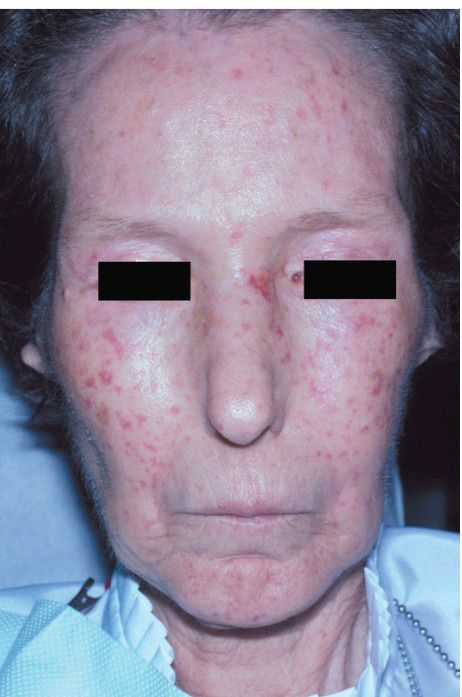 The patient shows numerous red facial macules representing telangiectatic blood vessels.