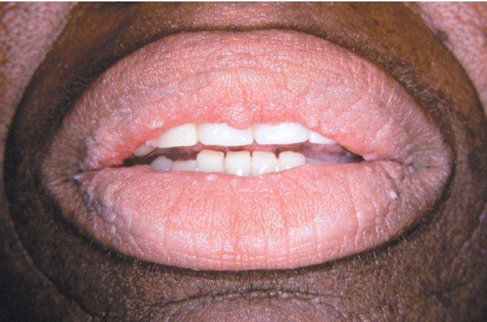 The vermilion zone of the lips is affected. (Courtesy of Dr. George Blozis.)