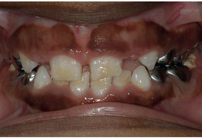 Hypocalcification of the teeth is seen in this child who had vitamin D deficiency related to a diet of breast milk exclusively and lack of adequate sunlight exposure.