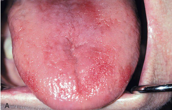 The dorsal tongue shows erythema and atrophy.