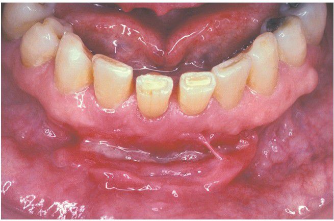 This patient has a linear ulceration of the mandibular vestibule. An adhesion between the alveolar and labial mucosae was caused by repeated ulceration and healing of the mucosa at this site.