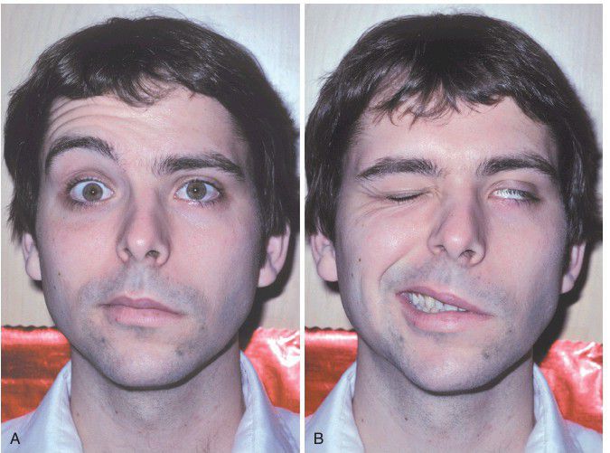 Paralysis of the facial muscles on the patient’s left side. A, Patient is trying to raise the eyebrows. B, Patient is attempting to close the eyes and smile.