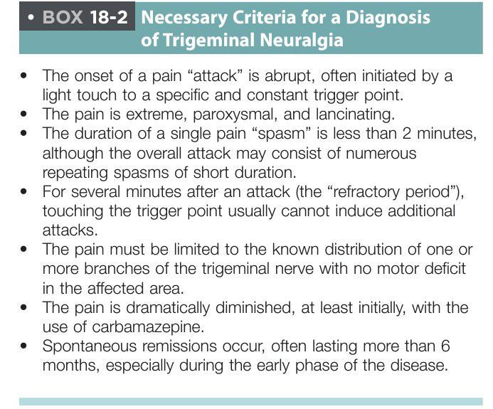 Trigeminal neuralgia, the most serious and the most common of the facial neuralgias, is characterized by an extremely severe electric shocklike or lancinating (i.e., sharp, jabbing) pain limited to one or more branches of the trigeminal nerve.