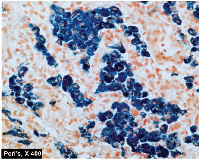 Haemosiderin pigment in the cytoplasm of hepatocytes seen as Prussian blue granules.