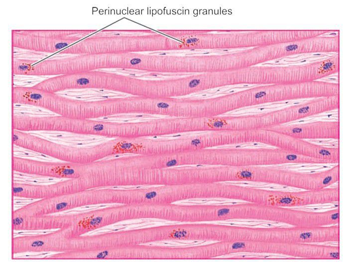 Brown atrophy of the heart. The lipofuscin pigment granules are seen in the cytoplasm of the myocardial fibres, especially around the nuclei.