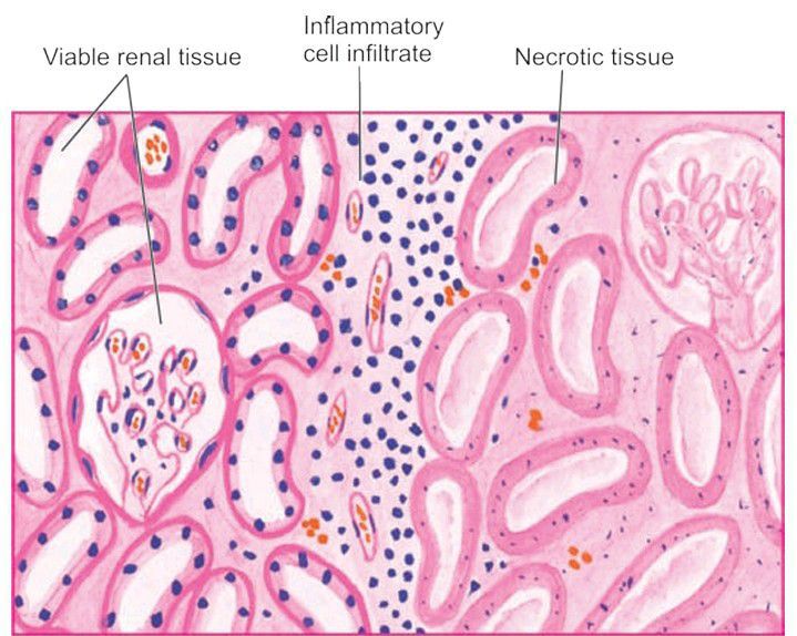 The affected area on right shows cells with intensely eosinophilic cytoplasm of tubular cells but the outlines of tubules are still maintained. The nuclei show granular debris. The interface between viable and non-viable area shows nonspecific chronic inflammation and proliferating vessels.
