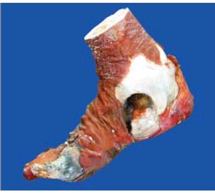 The gangrenous area is dry, shrunken and dark and is separated from the viable tissue by clear line of separation.
