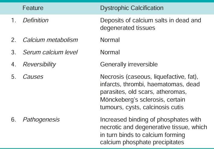 Dystrophic calcification may occur due to 2 types of causes: Calcification in dead tissue Calcification of degenerated tissue.