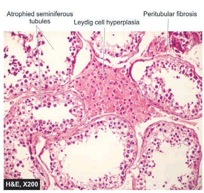 The seminiferous tubules show hyalinisation, peritubular fibrosis and diminished number and size of spermatogenic elements. There is prominence of Leydig cells in the interstitium.