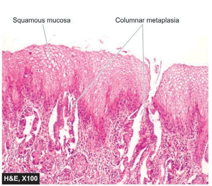 Part of the oesophagus which is normally lined by squamous epithelium undergoes metaplastic change to columnar epithelium of intestinal type.