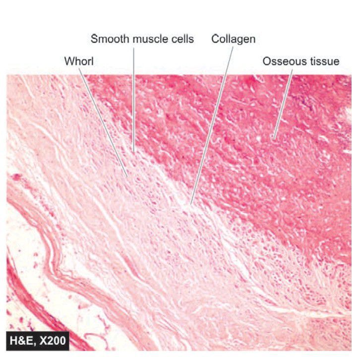 The whorls composed of the smooth muscle cells and fibroblasts show osseous metaplasia in the centre.