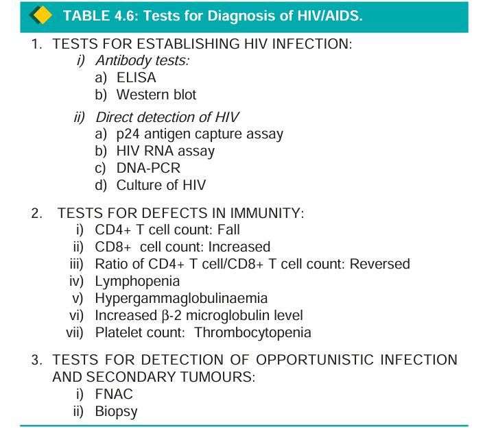 The investigations of a suspected case of HIV/AIDS are categorised into 3 groups: tests for establishing HIV infection, tests for defects in immunity, and tests for detection of opportunistic infections and secondary tumours. However, usually initial testing for antibodies is done against HIV by ELISA and confirmation by Western blot or immunofluorescence test.