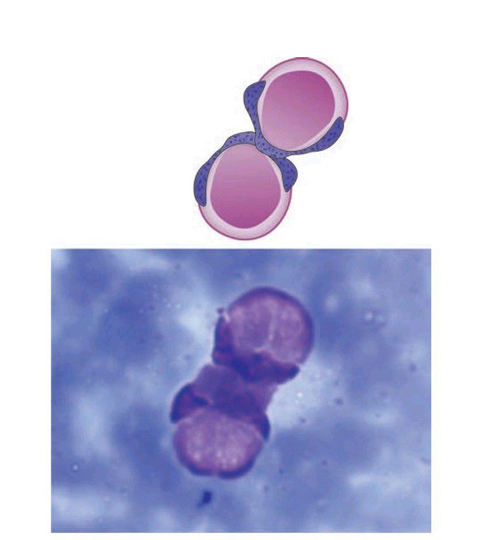 . There are two LE cells having rounded masses of amorphous nuclear material (LE body) which has displaced the lobes of neutrophil to the rim of the cell.