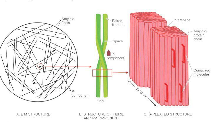 A, Electron microscopy shows major part consisting of amyloid fibrils (95%) randomly oriented, while the minor part is essentially P-component (5%) B, Each fibril is further composed of double helix of two pleated sheets in the form of twin filaments separated by a clear space. P-component has a pentagonal or doughnut profile. C, X-ray crystallography and infra-red spectroscopy shows fibrils having cross-β-pleated sheet configuration which produces periodicity that gives the characteristic staining properties of amyloid with Congo red and birefringence under polarising microscopy.