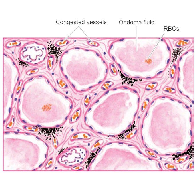 The alveolar capillaries are congested. The alveolar spaces as well as interstitium contain eosinophilic, granular, homogeneous and pink proteinaceous oedema fluid alongwith some RBCs and inflammatory cells.