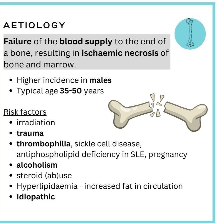 Avascular necrosis is a disease that results from the temporary or permanent loss of blood supply to the bone.