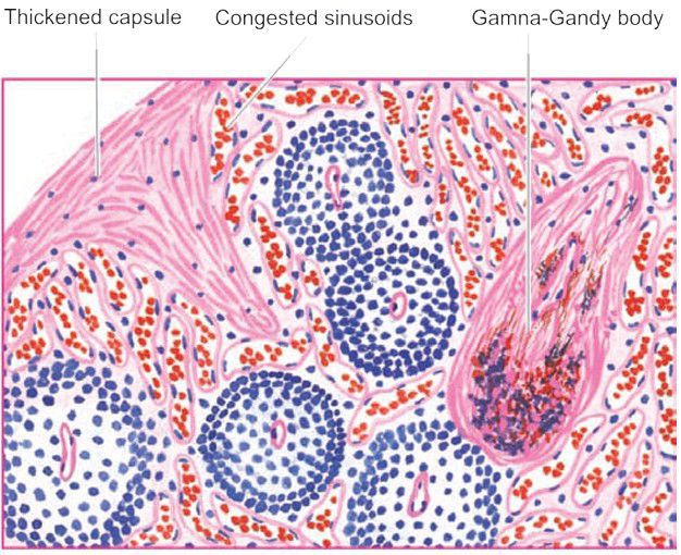 . The sinuses are dilated and congested. There is increased fibrosis in the red pulp, capsule and the trabeculae. Gamna-Gandy body is also seen.