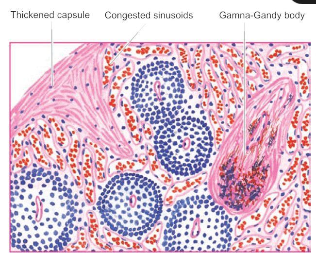 CVC spleen. The sinuses are dilated and congested. There is increased fibrosis in the red pulp, capsule and the trabeculae. Gamna-Gandy body is also seen.
