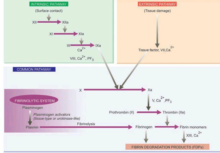 Schematic representation of pathways of coagulation mechanism and fibrinolytic system.