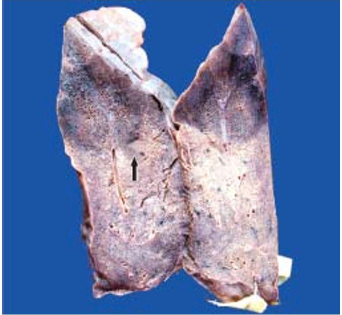 . The sectioned surface shows dark tan firm areas (arrow) with base on the pleura.