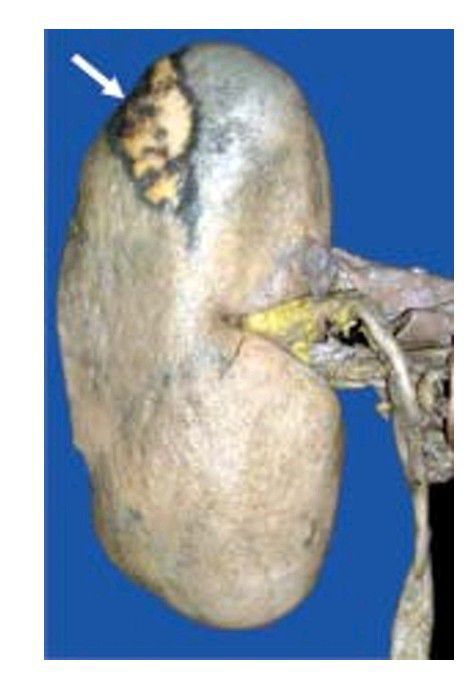 The wedge-shaped infarct is slightly depressed on the surface. The apex lies internally and wide base is on the surface. The central area is pale while the margin is haemorrhagic