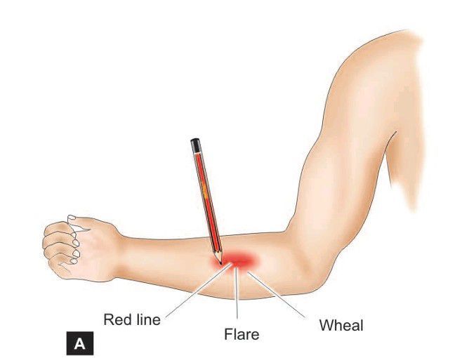 Triple response’ elicited by firm stroking of skin of forearm with a pencil. Leads to microscopic features of triple response of the skin.
