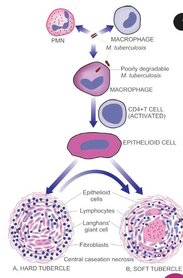 Schematic evolution of tubercle. In fully formed granuloma, the centre is composed of granular caseation necrosis, surrounded by epithelioid cells and Langhans’ giant cells and peripheral rim of lymphocytes bounded by fibroblasts.